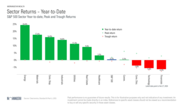 The chart above shows the returns of each sector as of the end of February. You can see that energy is leading the way (this was before the Iran conflict) and technology is lagging so far this year. Could this be the harbinger of a deeper drop in the tech sector, which would transmute to a lower broad market as in 2000?