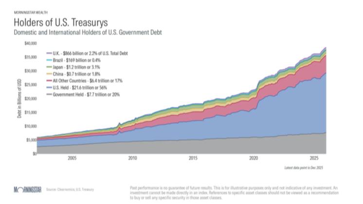 This chart illustrates the holders of those treasuries. China used to own well over $1.2 trillion; today they own less than $700 billion. Brazil used to own well over $300 billion; today they own $169 billion. Almost every country has reduced their treasury holdings, while we have been increasing our domestic purchases—meaning more and more, we are buying our own debt.